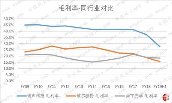 瑞声科技的毛利率从2017年的41.3%下滑至2018年的37.2%,而且2019年上半年下滑至27.5%。