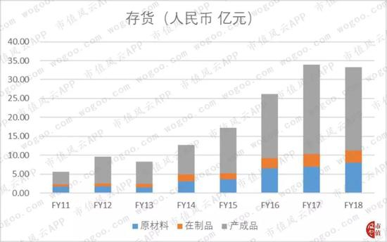 2018年,公司存货总计33.2亿元,同比略微下降2.3%。存货当中,产成品占66.4%,占比最高,在制品和原材料分别占9.4%和24.3%。