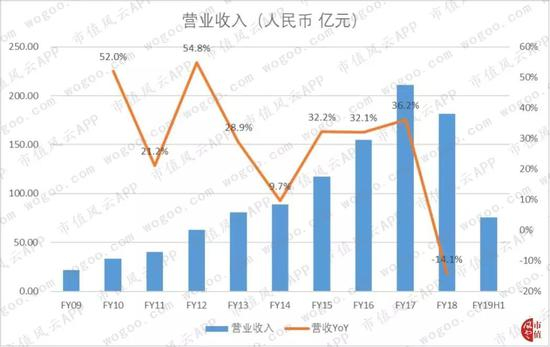 我们再复习下瑞声科技的业绩,2018年公司实现营业收入181.3亿元,同比下滑14.1%,以2009年为基准,CAGR为26.4%。