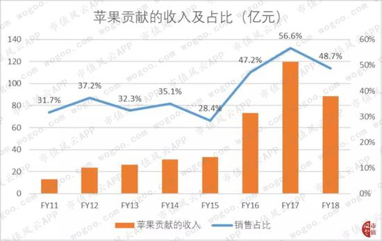 根据公司披露的“第一大客户贡献的销售占比”,2018年苹果贡献的营收为88.3亿元,占总营收比重为48.7%。