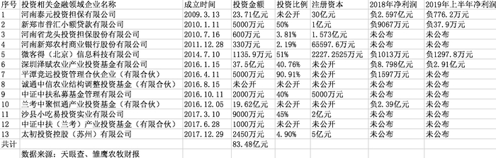 据记者粗略统计,自2009年至今雏鹰农牧在类金融领域的投资高达83.48亿元。而截至2019年上半年,雏鹰农牧对子公司和联营、合营企业投资总额达90.84亿元,其中对类金融领域公司的投资总额约为64.35亿元(包括计算投资损益、投资额减少情况)。