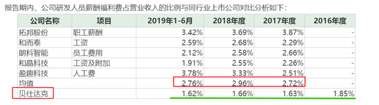 不仅是研发费用率低于同行公司平均水平,贝仕达克研发人员薪酬福利费占营业收入的比例在同行公司中也是垫底。2016年、2017年、2018年和2019年上半年,公司研发人员薪酬福利费分别为605.71万元、770.24万元、927.25万元和622.09万元,占营业收入的比例分别为1.85%、1.63%、1.66%和1.62%,同期,同行公司研发人员薪酬福利费占营业收入比值的均值分别是2.72%、2.96%和2.76%(无2016年度数据)。