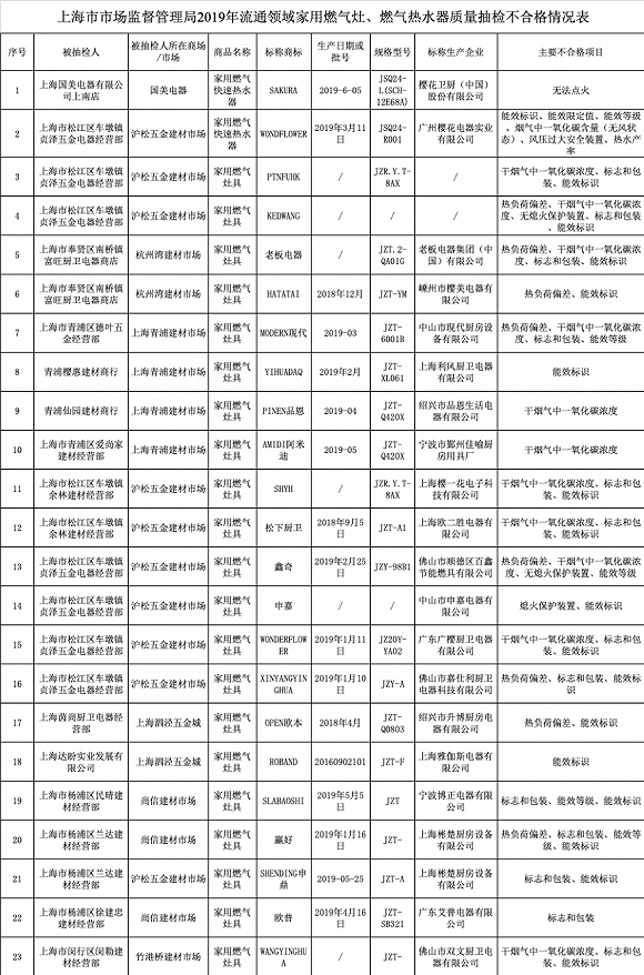 近日,上海市市场监管局对市场上销售的49批次家用燃气灶、家用燃气热水器进行抽检,发现23批次产品不合格(其中2批次为三无产品)。涉及老板电器、樱花卫厨、欧普和松下厨卫等知名品牌。
