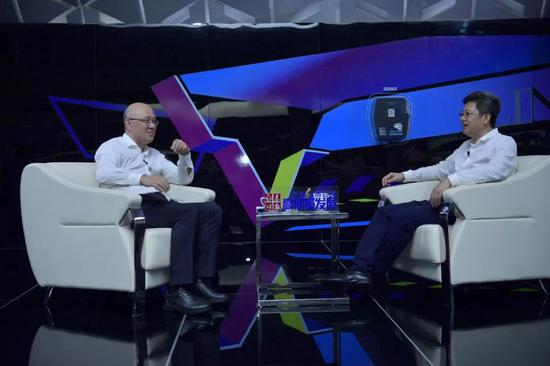 证券时报社长兼总编辑何伟(左)对话特锐德董事长于德翔 (宋春雨/摄)