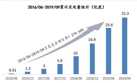 经过5年耕耘,目前特来电在全国建成23万个充电桩,市占率40%,相当于第二名、第三名的总和。充电量近三年实现飞跃式增长,2016到2018年分别为1.2亿度、4.4亿度、11.3亿度,复合增长率超过200%,今年以来的充电量已超过2018年度。