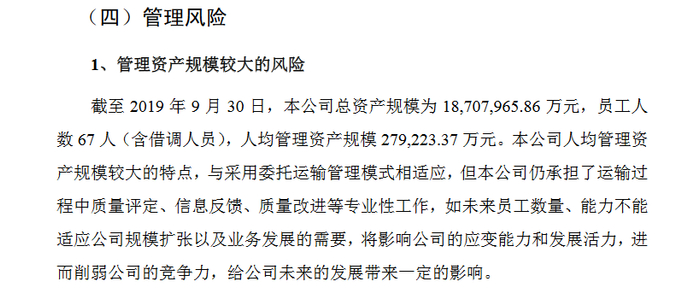 新京报记者梳理招股书注意到,截至2019年9月30日,京沪高铁总资产规模为1870.79亿元,员工人数67人(含借调人员),人均管理资产规模27.92亿元。本公司人均管理资产规模较大的特点,与采用委托运输管理模式相适应。