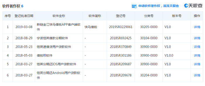从2018年恺英小贷注册的软件著作权来看,该公司旗下包括贷款超市“借钱呗”和“速借贷”、现金贷产品“分期还”。另外,就在今年3月金江小贷还注册了一款名为“快马借钱”的软件,但目前没有关于快马借钱的公开资料。