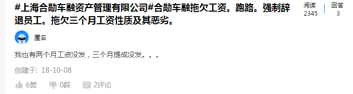 另外,合勋车融在2017年恺英网络投资时就连续两年处于亏损状态,且资不抵债,2018年下半年更被传出有强制辞退员工、拖欠工资提成长达数月之久的情况。