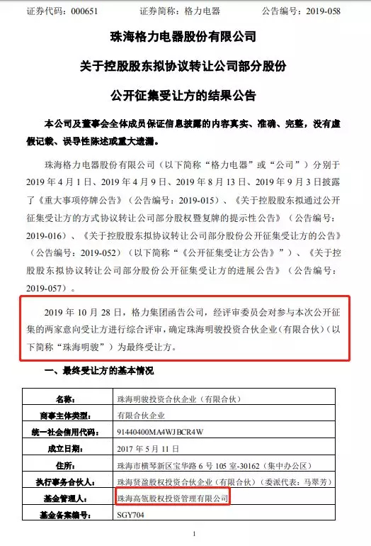10月28日晚间,格力电器发布公告称,格力电器最终选定珠海明骏投资合伙企业(有限合伙)作为格力电器15%股权转让的受让方。
