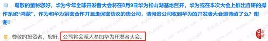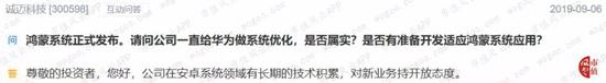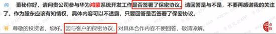 其实公司公告中压根没提到过鸿蒙系统,这位仁兄也不知道从哪儿听说的。而公司秉着不承认不否认不拒绝的原则,回复投资者说是有保密协议,但是否与鸿蒙系统有关就不告诉你了,话语暧昧不清。