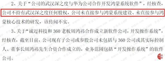 当然,传闻只是传闻,既然对外投资都已于13日宣布取消了,公司在10月21日的回复函中自然一一否认:不持有深度科技股权、没有和周鸿祎先生合资成立业务范围包括“开发操作系统”的公司。