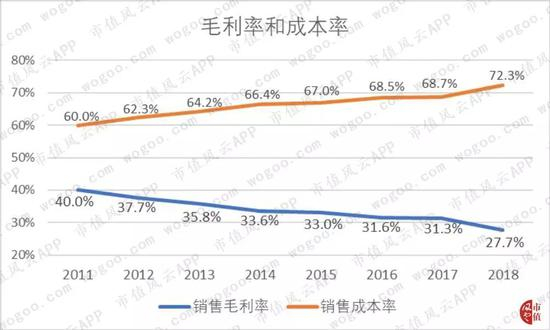 目前主要的盈利来源是对技术开发人员的管理, 随着成本率不断上升,公司的销售毛利率从2011年的40%下滑到2018年的27.7%。