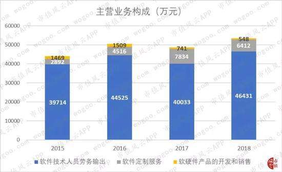 上市以来,公司主营业务从2015年4.4亿增至2018年5.34亿,整体规模小幅增长,业务结构变化不大。2018年,软件技术人员劳务输出业务收入占比约87%,也就是说,公司主要干的是人力外包的活儿。