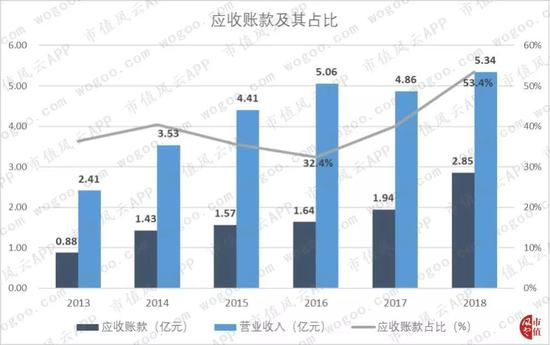 2016-2018年,应收账款余额从1.64亿增至2.85亿,占营业收入比重也从32%升至53%,2018年末的应收账款较上年末增加9121.95万元,增幅46.98%。