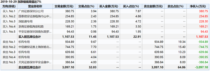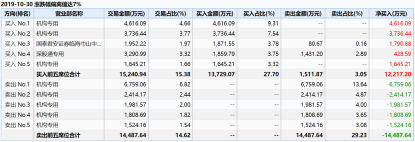 10月29日、30日两个交易日,伟星新材成交金额分别为4835万元和4.96亿元,其也因日跌幅偏离值达7%而连续登上龙虎榜。其中,在这两天的前五位卖出席位中,机构专用席位占了8位,而10月30日卖出的前五位席位全部为机构专用。