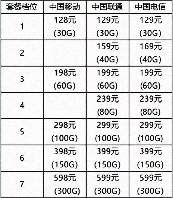 中国联通、中国电信5G套餐起步档位资费均定在129元,且其他套餐基本相同。只是在第二档位,电信的169元标准要比联通贵10元,其他档位价格两家完全相同。