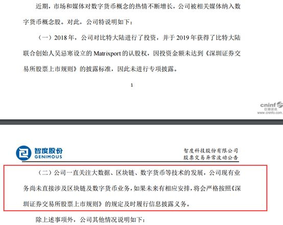 10月14日,智度股份发布公告称,近期,市场和媒体对数字货币概念的热情不断增长,公司被相关媒体纳入数字货币概念股。对此,智度股份特说明如下:2018年,公司对比特大陆进行了投资,并于2019年获得了比特大陆联合创始人吴忌寒设立的Matrixport的认股权,但因投资金额未达到《深圳证券交易所股票上市规则》的披露标准,因此未进行专项披露。此外,公司一直关注大数据、区块链、数字货币等技术的发展,公司现有业务尚未直接涉及区块链及数字货币业务。