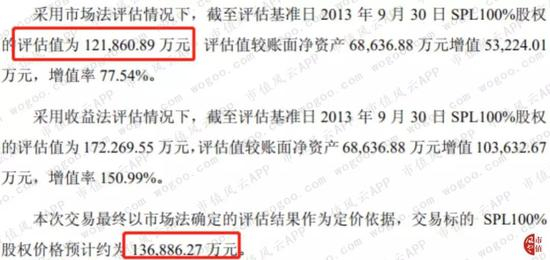 2014年4月,美国海普瑞以13.69亿元的价格收购SPL100%股权。以2013年9月30日为评估基准日,SPL的净资产账面价值为6.86亿元,市场法下的评估值为12.19亿元,收益法下评估值为17.23亿元。