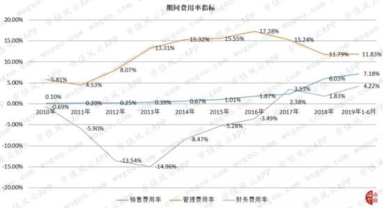 2010年至2013年,在利息收入较多的情况下,期间费用率持续下降,2011年至2013年期间费用率均为负;2014年开始,利息收入逐渐减少,在利息费用和管理费用逐渐增多的共同作用下,期间费用率持续走高,且2018年并购多普乐,市场推广费增加,导致销售费用率也大幅上升,因此期间费用率也逐步走上巅峰。