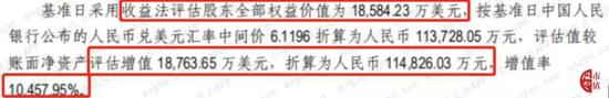 然而用收益法评估后,赛湾生物就值钱了!评估值高达1.86亿美元,折合人民币11.37亿元,多出11.48个亿,评估增值104.58倍!