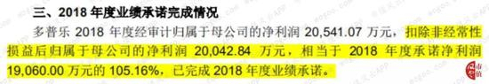 多普乐业绩完成的如何呢?2018年实现扣非净利润2亿元,占承诺业绩的105.16%,十分精准地完成了业绩承诺!