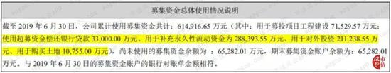 据海普瑞2019半年报披露,公司用3.3亿元超募资金偿还了银行贷款、28.84亿元补充永久性流动资金、对外投资花掉21.12亿元,另外还用1.08亿买了块地。