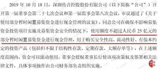 10月19日,科创板上市公司传音控股(688036.SH)发布公告,拟使用额度不超过25亿元的部分,购买一些安全性高、流动性好、有保本约定的投资产品。