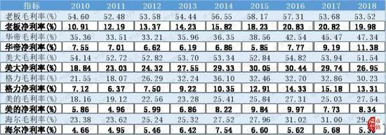 毛利率反映企业议价能力,因为行业是良性竞争,老板电器、华帝股份、浙江美大毛利率在50%左右,而格力、美的、海尔则一般在30%以下。