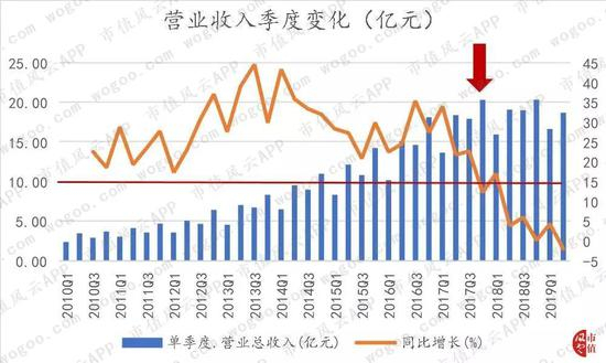 业绩拐点出现在2017年四季度。2017年四季度,营业收入同比增速下滑至12%,此前单季度增速超过20%才是常态。