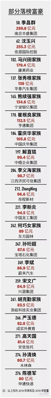 榜单显示,还有超过80位富豪今年未能蝉联上榜。从榜单看,大多数富豪因公司股价下跌,个人财富值跌出门槛而落榜。