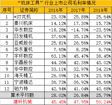 1.“机床工具”行业共有12家上市公司,2018年平均毛利率为25.79%,只有建科机械的一半,而且建科机械比其中任何一家都高。
