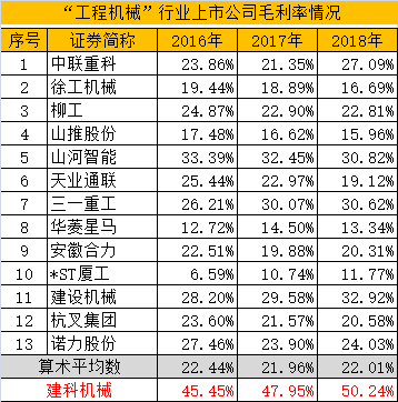3.“工程机械”行业共有13家上市公司,这个应该是与建科机械最相近的行业了,2018年平均毛利率为22.01%,也是不到建科机械的一半,其中2018年最高的为32.92%。