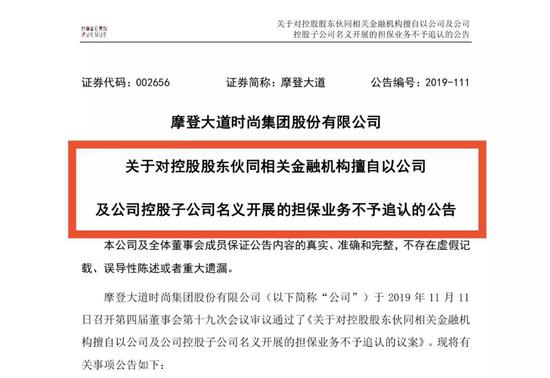 2019年11月13日,摩登大道(002656.SZ)发布《关于对控股股东伙同金融机构擅自以公司及公司控股子公司名义开展的担保业务不予追认的公告》。
