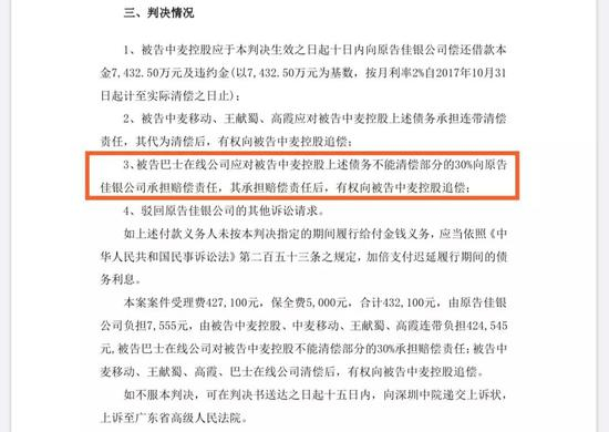 2019年4月4日,*ST巴士公告称,收到深圳市中级人民法院的《民事判决书》:被告巴士在线公司应对被告中麦控股债务不能清偿部分的30%向原告佳银公司承担赔偿责任,其承担赔偿责任后,有权向被告中麦控股追偿。