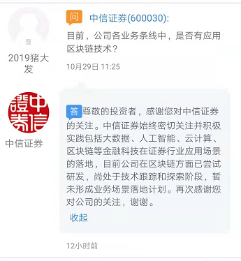 财联社(上海,记者 万佳丽)讯,11月18日,中信证券在互动平台介绍,公司始终密切关注并积极实践包括大数据、人工智能、云计算、区块链等金融科技在证券行业应用场景的落地,目前公司在区块链方面已尝试研发,尚处于技术跟踪和探索阶段,暂未形成业务场景落地计划。