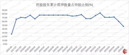 上图是控股股东星野投资自2016年8月起的累计质押比例示意图,可以明显看到,在2019年4月以前,星野投资的累计质押数量占持股比例基本位于80%的高位,直至4月以后该比例才有所下降。