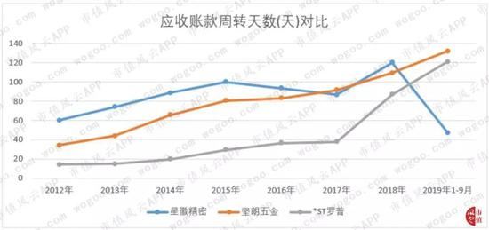 从上图可知,收购泽宝技术以前,除2017年与坚朗五金指标相近外,自2012年起各年星徽精密的应收账款周转天数在三家公司中一直居于最高位。