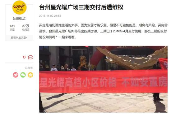序号3的浙江台州项目也是星光耀广场项目。2014年7月,星浩资本作为唯一的竞拍者,几乎以底价9.36亿元摘得上述地块,实际出让面积129924平米,建筑面积约50万方,是台州当年截至当日的地王。目前,台州星光耀广场均价9000元左右。如出一辙的是,业主同样拉起横幅,投诉项目强制交房、质量差,还上了台州电视台和著名的《1818黄金眼》。