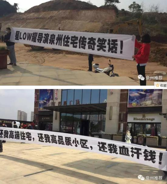 泉州星光耀也遭遇了业主激烈维权。2015年7月,星光耀被福建省住房和城乡建设厅要求停工整改,2015年11月泉州星光耀称有业主敲诈勒索。但一年后的2016年12月,福建自媒体“晋江大城小事”曝出了业主拉横幅的照片,甚至喊出“17000的房价,不如4000安置房的配置”,直指的仍是货不对板、工程质量差等问题。
