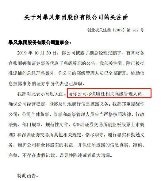 10月31日,深交所发布关注函表示,已关注到暴风公司高级管理人员已全部辞职,协助信息披露事物的证券事务代表也已辞职,要求公司尽快聘用相关高级管理人员,确保经营稳定。