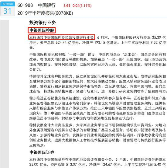 再查中国银行2019年半年报。该半年报显示,中国银行通过中银国际控股经营投资银行业务,通过中银国际证券在中国内地经营证券业务。