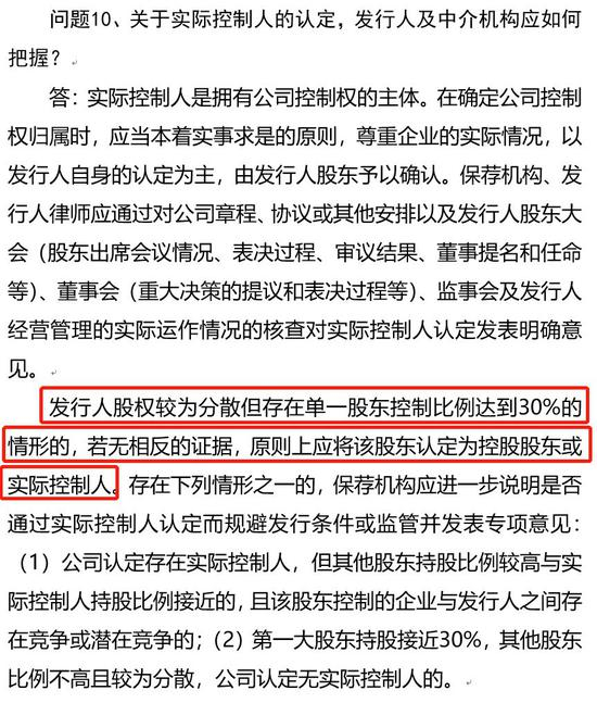 2019年3月25日,中国证监会发布《首发业务若干问题解答》,其中《解答》(一)问题10是关于实际控制人的认定。该问题解答明确规定:发行人股权较为分散但存在单一股东控制比例达到30%的情形的,若无相反的证据,原则上应将该股东认定为控股股东或实际控制人。