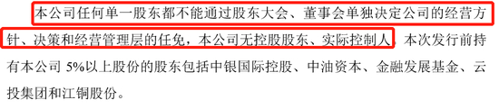 招股书披露:公司任何单一股东都不能通过股东大会、董事会单独决定公司的经营方针、决策和经营管理层的任免。因此认定公司无控股股东、实际控制人。