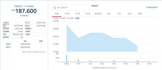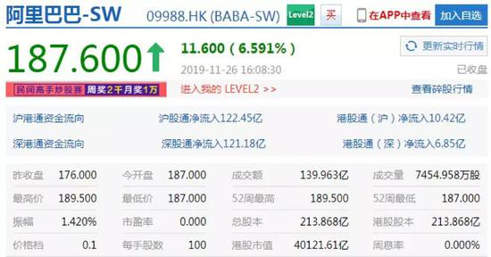 11月26日上午9:30,阿里巴巴集团(09988.HK)正式在港交所挂牌上市,成为首个同时在美股和港股两地上市的中国互联网公司。鸣锣后,阿里巴巴-SW以187港元开盘,较发行价176港元,上涨6.25%。股价最高时达到189港元,最终以187.6港元报收。成交额为139.963亿,成交量为7274.958万股,总市值为40121.61亿港元。