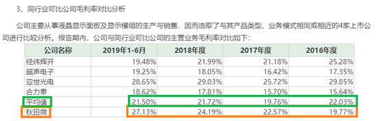 随着公司毛利率的增长,秋田微最近两个会计年度的毛利率也超过了同行平均水平。2017年、2018年和2019年上半年,公司毛利率平均高于同行公司同期毛利率均值2.81、2.47及5.63个百分点。对此,秋田微解释称:公司主营业务毛利率与同行业可比公司基本一致。