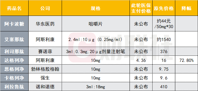 其中,新进医保的糖尿病药物多达六个,包括华东医药的阿卡波糖咀嚼片、阿斯利康的百泌达(Byetta,艾塞那肽注射液)、赛诺菲的利司那肽,以及三款新型的口服降糖药物SGLT2抑制剂——达格列净、恩格列净和卡格列净。另外,利拉鲁肽重新谈判,并续约成功。