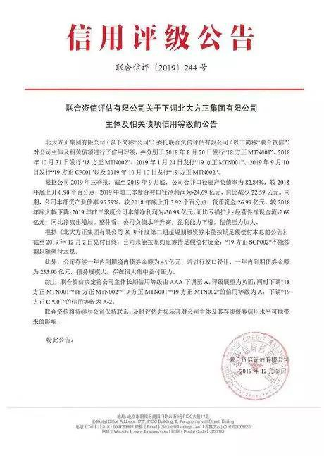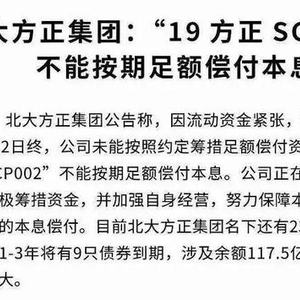 今天,北大方正有限公司由于流动资金紧张,本应于12月1日支付本息的“19方正SCP002”仍然未能按期足额偿付本息。