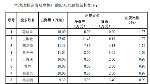 至此,摩擦厂不再持有北摩高科任何股份。与此同时,摩擦厂集体共有股持股比例已被稀释到10.46%,王淑敏、陈剑锋分别持有摩擦厂32.27%、26.55%的股份。