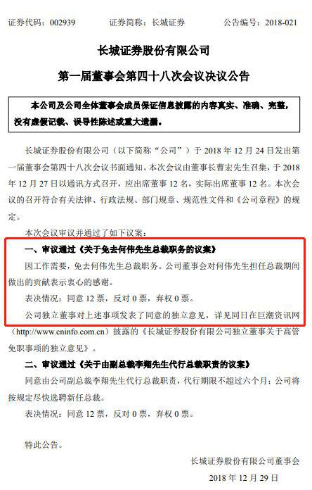2018年12月28日,长城证券公告称,因工作需要,免去总裁何伟职务,公司副总裁李翔代行总裁职责,代行期限不超过六个月;公司将按规定尽快选聘新任总裁。