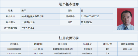行家注意到,在协会券商信息页面,长城证券的高管名单里已经去掉了朱军的名字。